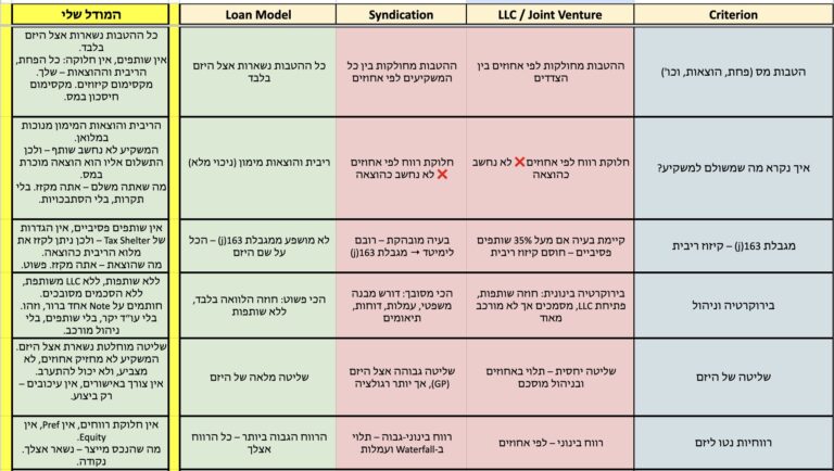 יצרתי עבורכם טופס השוואה מקיף בין המודלים המרכזיים לגיוס משקיעים – JV, Syndication, הלוואת משקיע והמודל שלי.